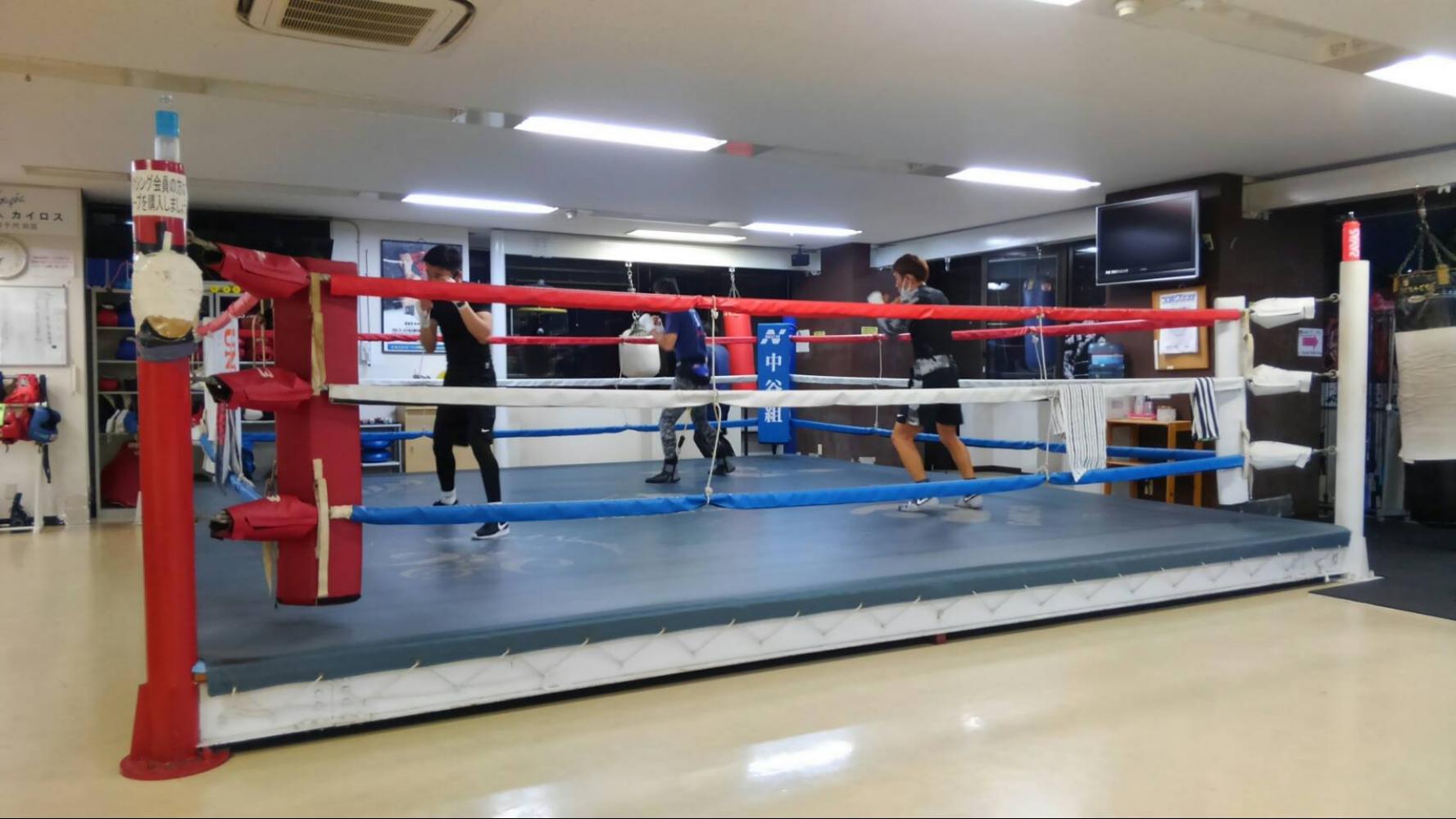 ボクシングフロアに足を入れると、初めに公式戦と同じサイズのリングが目に飛び込んできて、フロアの広さを感じさせられます。3人が同時に動いても余裕があります。