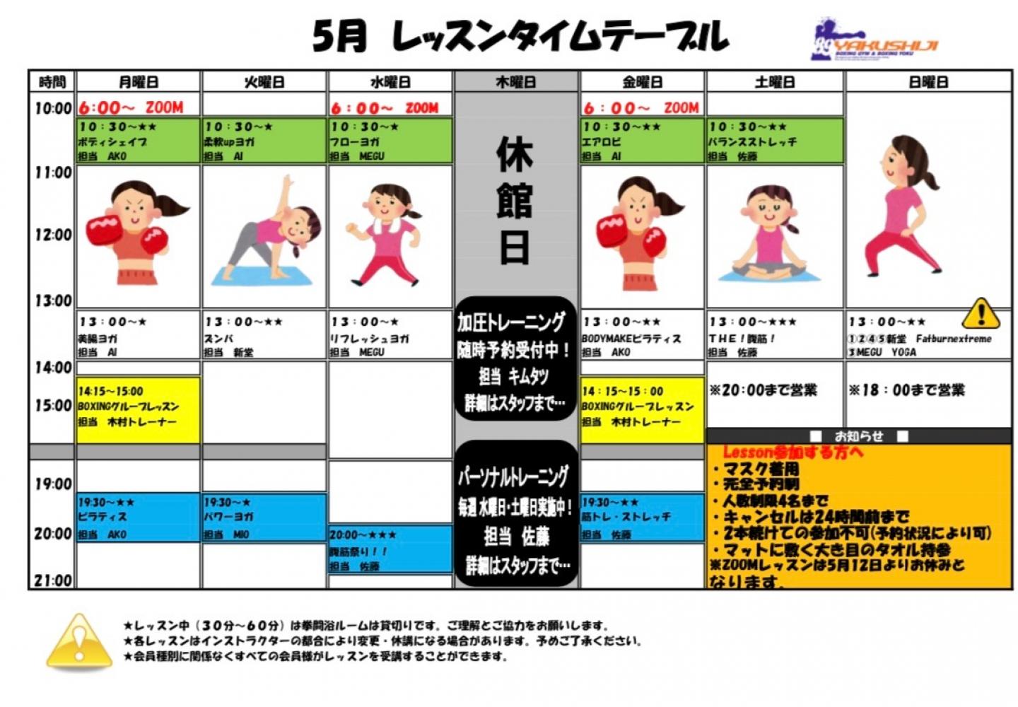 5月の薬師寺ジムレッスンタイムテーブルです!!